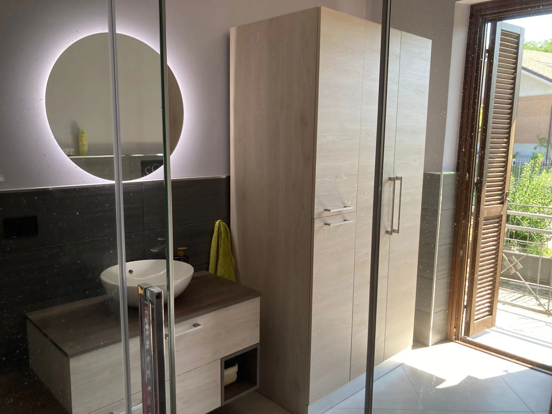 Arredo bagno con zona lavanderia. Nella stessa finitura delle basi sospese e asimmetriche, trovano spazio la COLONNA PORTALAVATRICE e ASCIUGATRICE. La colonna é dotata di ripiano intermedio in legno per permettere di posizionare i due elettrodomestici in verticale. La seconda colonna é completa di cesto portabiancheria e ripiani. L'armadio é realizzabile con oppure senza le ante di apertura/chiusura.