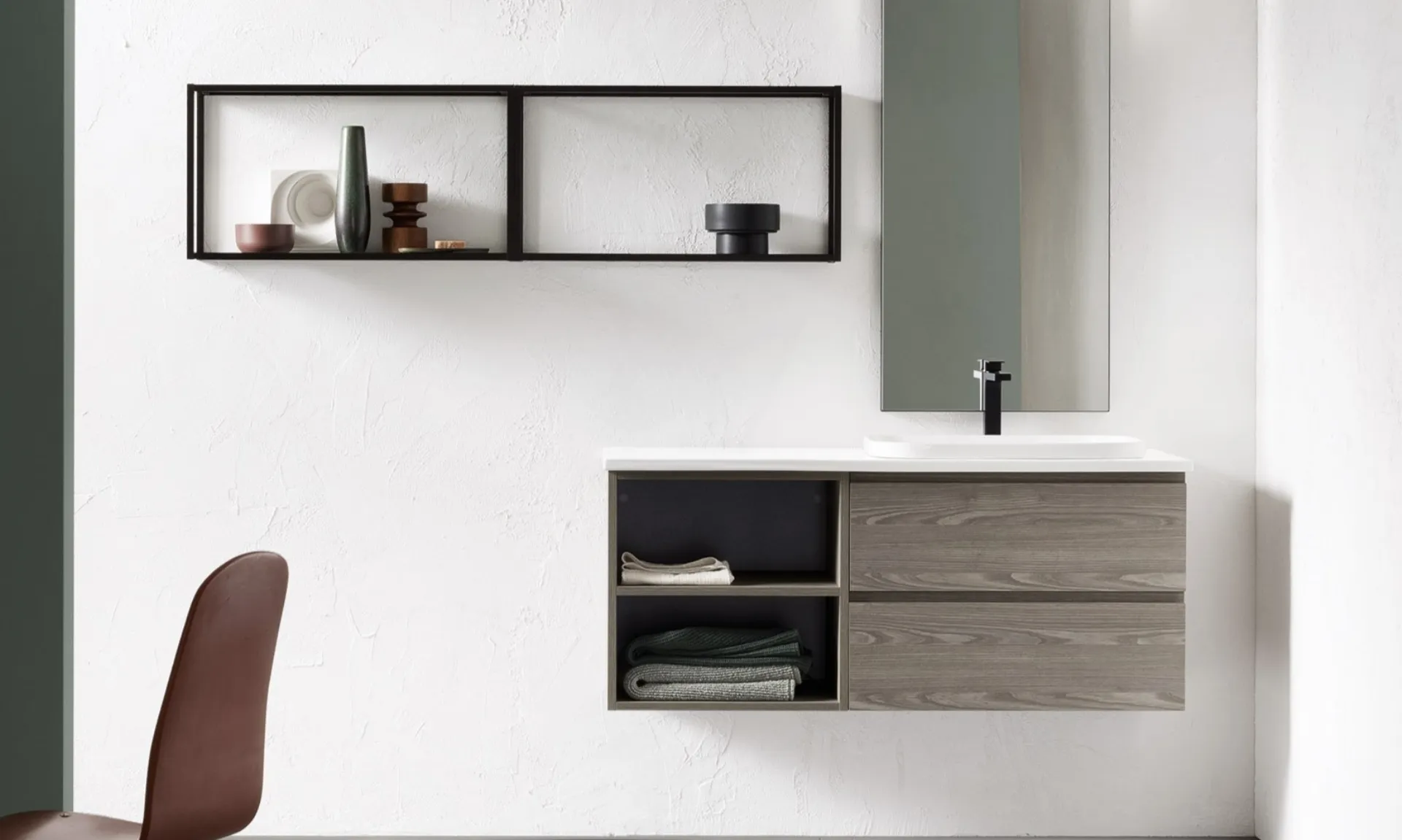 Arreda il tuo bagno moderno alla perfezione con B-GO BG002, mobili bagno sospesi e accessori in melaminico di Compab.