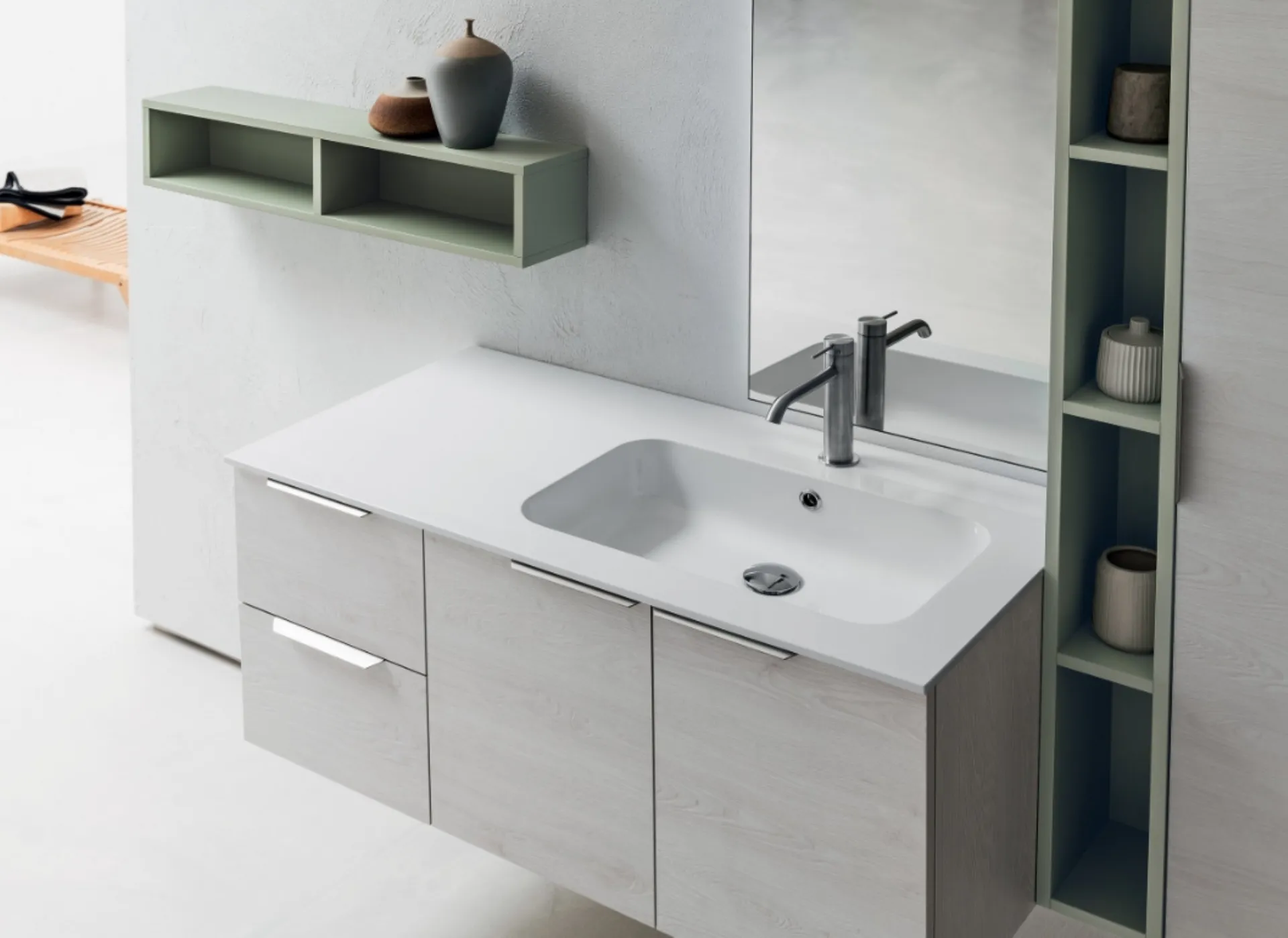 Mobili bagno sospesi in melaminico della firma Compab: clicca e scopri l'arredo bagno moderno B201 BD008 per la stanza del benessere.