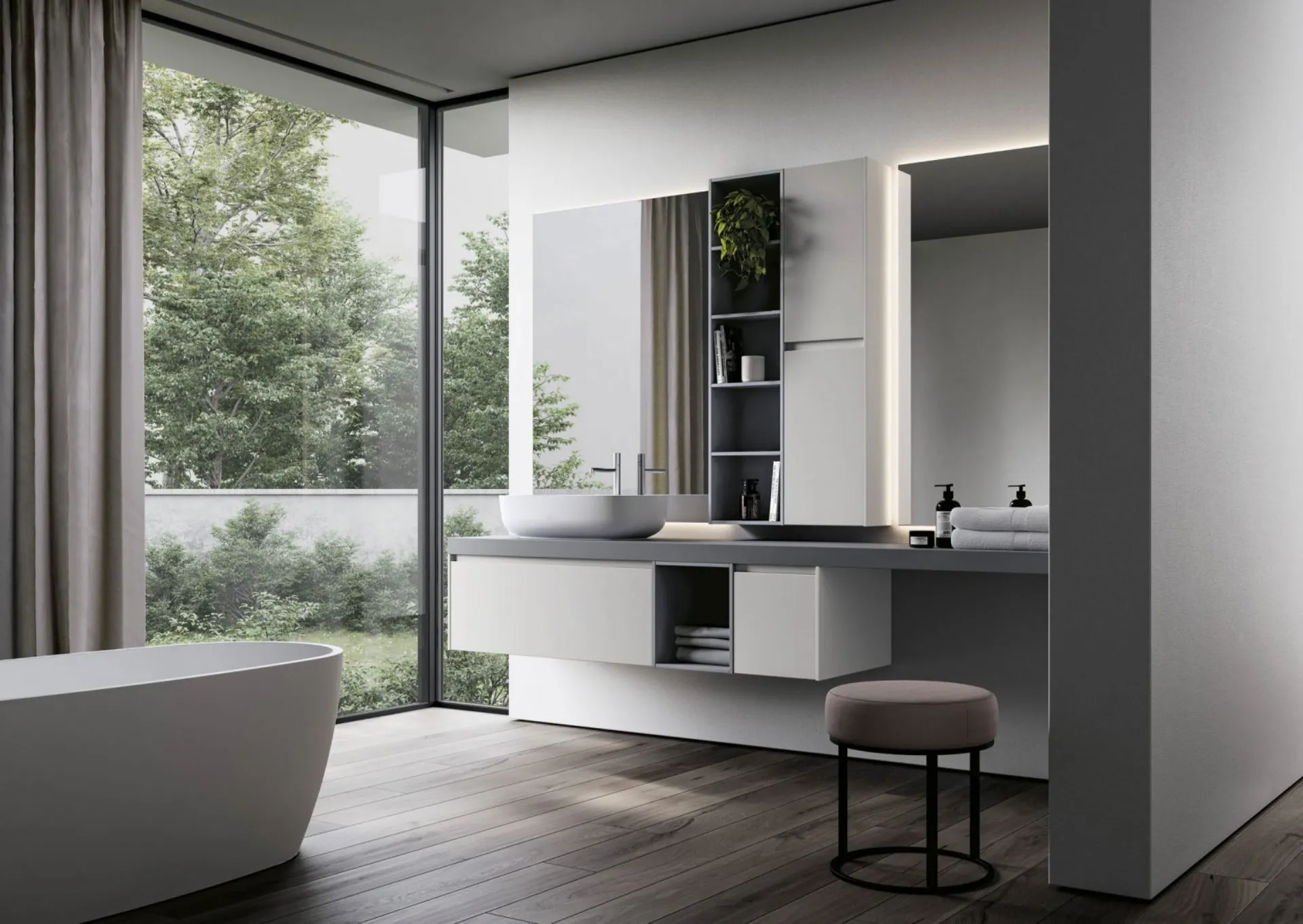 Arreda il bagno di casa design perfettamente con Nyù 12, mobili bagno sospesi e complementi in laminato di Ideagroup.