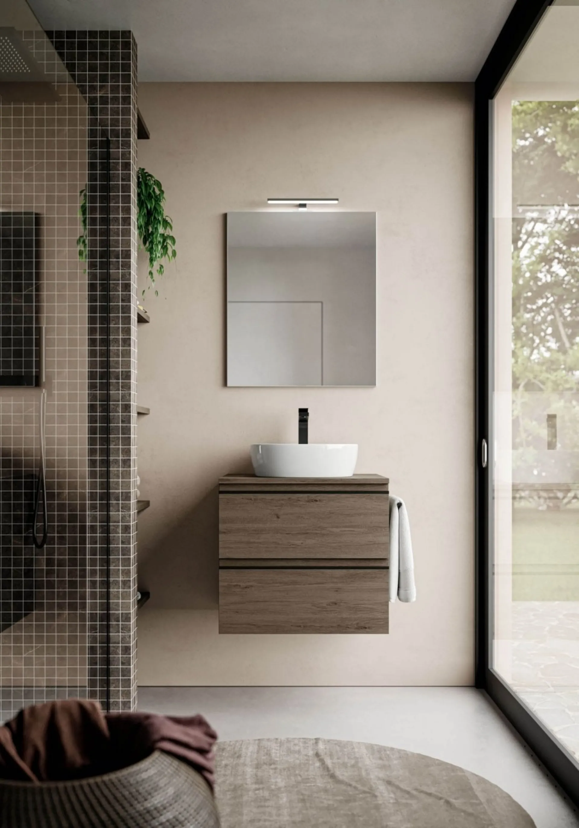 Arreda la stanza del benessere moderno perfettamente con System 03, mobili bagno sospesi e oggetti in laminato di Ideagroup.