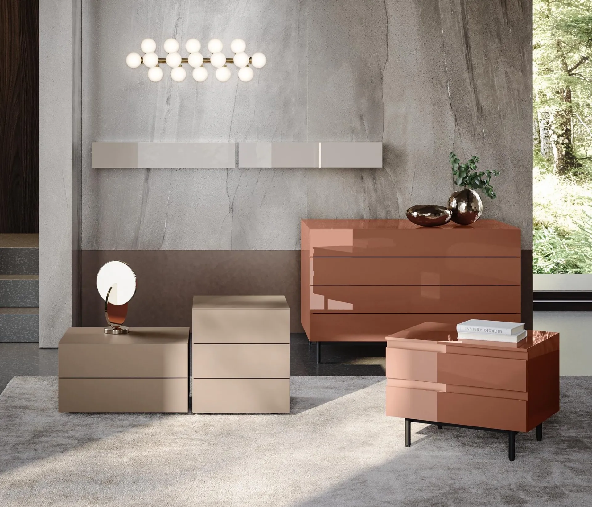 Vuoi allestire la zona notte con Comodini e cassettiere di Morassutti? Ecco qui il modello Live Gruppo Notte in laccato opaco per spazi moderni.