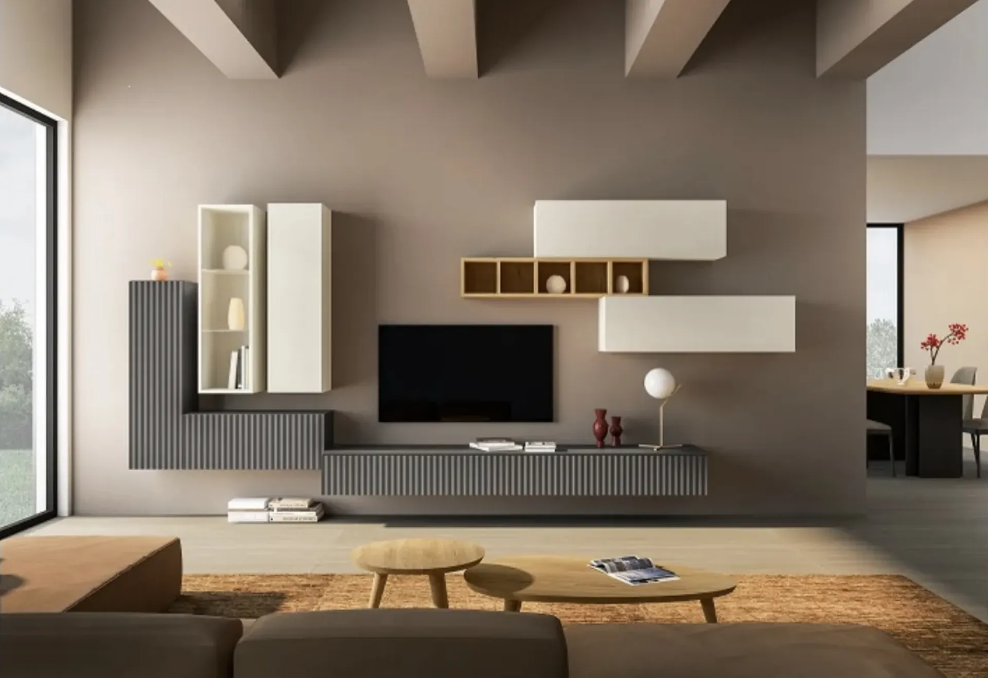 Clicca e scopri di più sulla parete attrezzata Wave e Cheba dell'azienda Fratelli Mirandola: è la soluzione dalle linee moderne ideale per te.