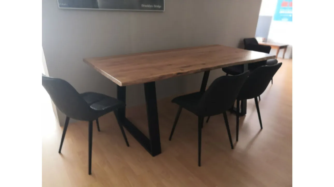 Tavolo fisso con piano in legno massiccio con bordo scortecciato. Le gambe a cavalletto sono in metallo verniciato nero opaco e conferiscono solidità all'intera struttura.